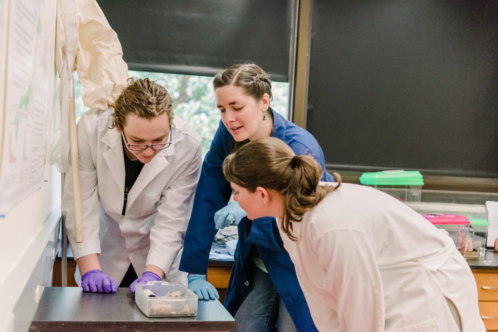 Sarah Stellwagen discusses spider biology with Tyler Montgomery ’20, biochemistry and biological sciences, and Genevieve Ahearn ’19, biological sciences and environmental science.